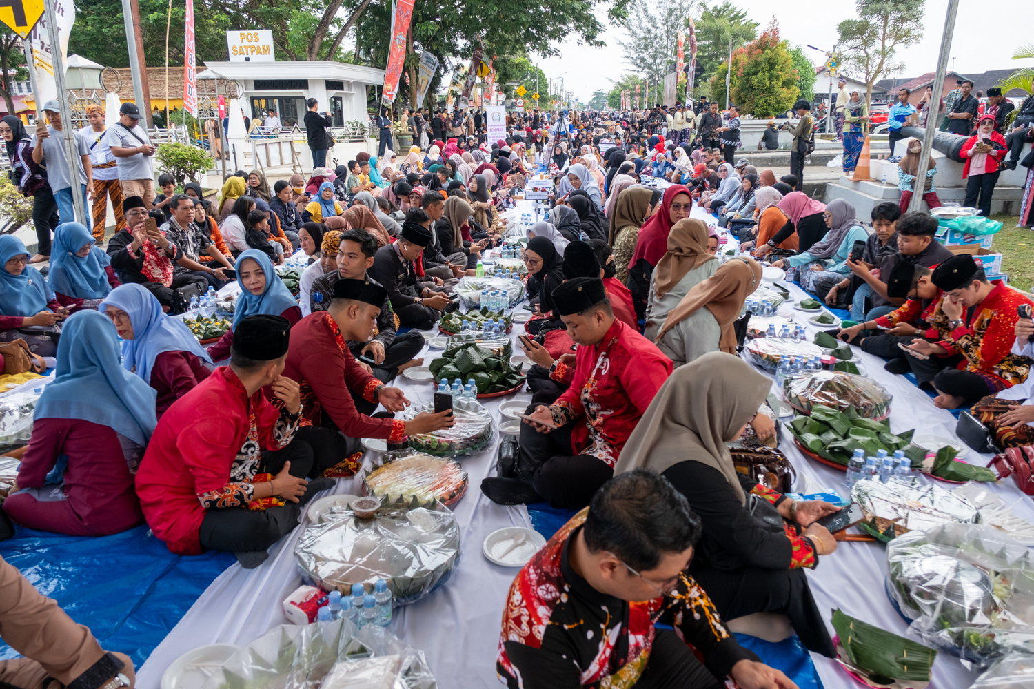 Ribuan masyarakat dari berbagai lapisan duduk bersila di sepanjang jalan lokasi beseprah, menikmati santapan bersama dalam suasana kebersamaan.